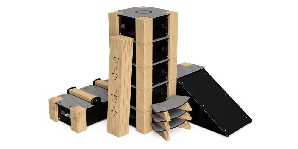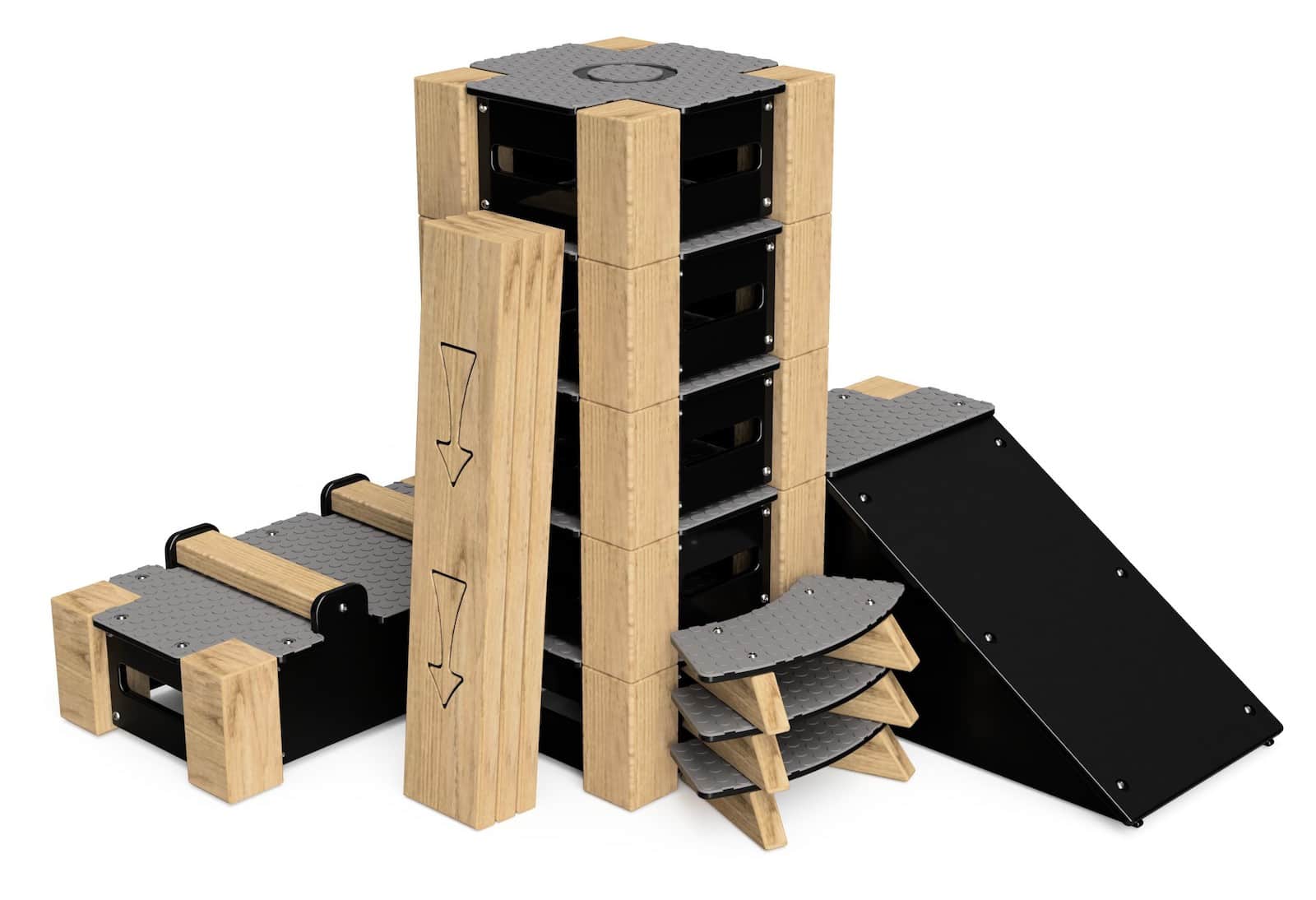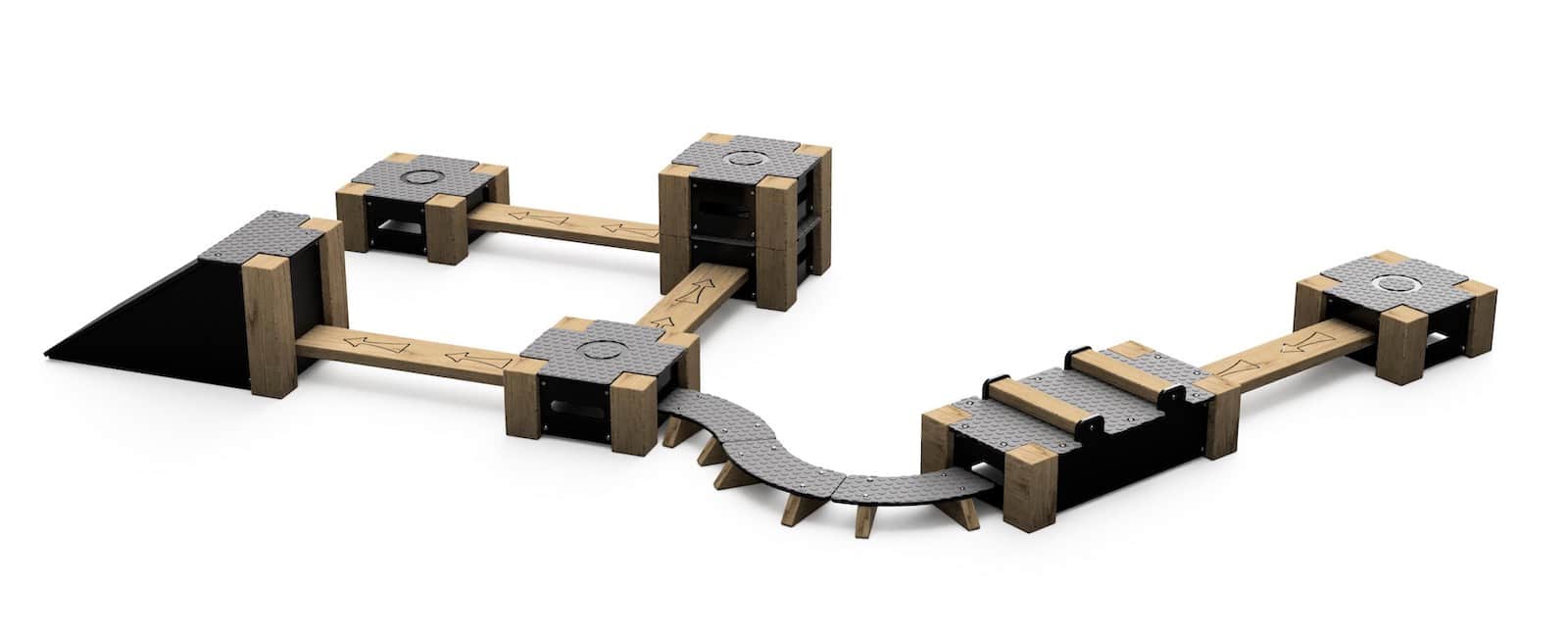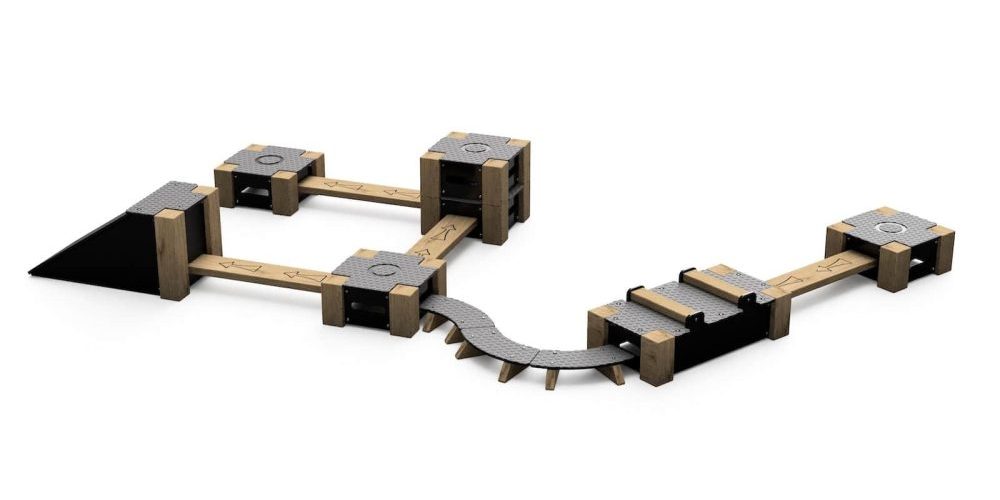 Lock Block 14-Piece Set is a versatile indoor and outdoor play trail system designed to promote balance, coordination, and active movement through configurable pathways. Manufactured from durable, play-grade timber and high-density polyethylene (HDPE), each unit is engineered for strength, weather resistance, and long-term performance. The modular blocks and linking beams create secure, interlocking trail formations, while the textured, slip-resistant surfaces enhance user safety during active play. The system is fully stackable for compact storage when not in use, making it ideal for flexible spaces. This expanded set includes additional slide and hurdle modules that can be seamlessly integrated to increase play value and adapt the course to different ages and skill levels.